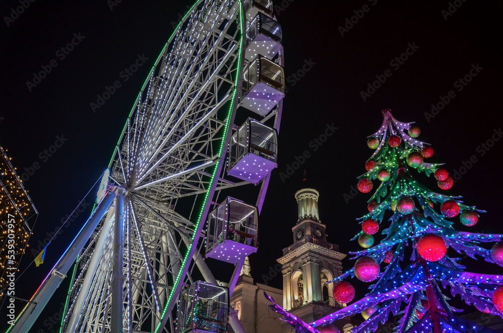 Ferris wheel and New Year tree, at traditional Christmas fair on Kontraktova Square. Winter holiday in Kyiv, Ukraine
