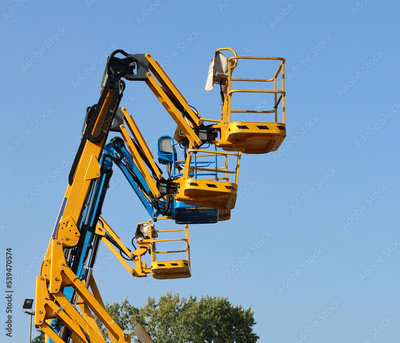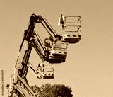 Row of aerial working platforms of cherry picker, side by side against blue sky