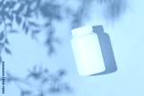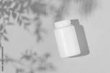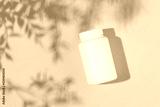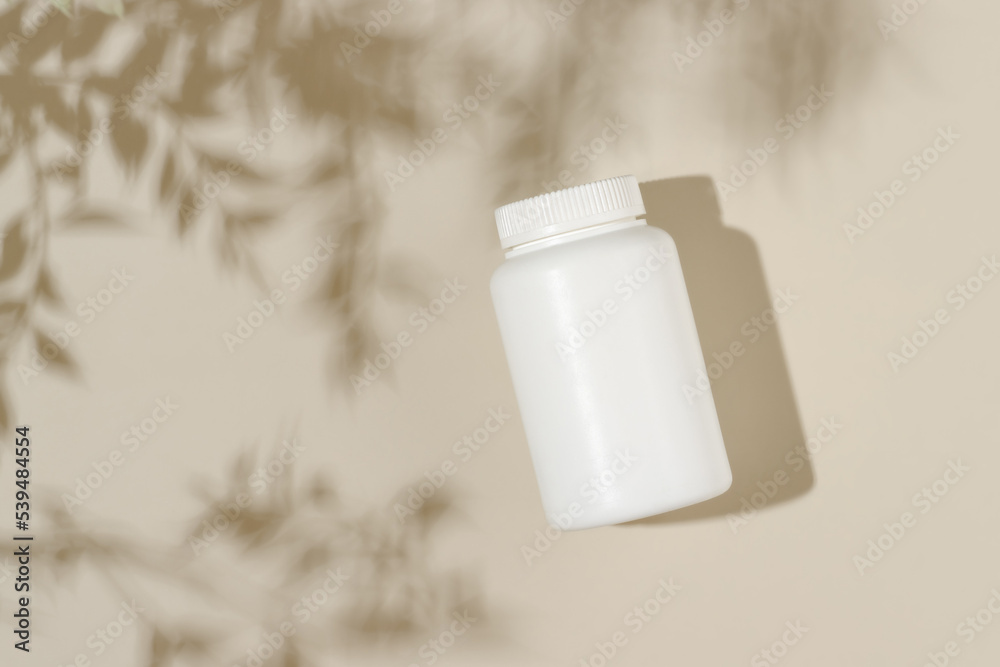 Vitamin medical bottle on beige background with leaves shadows, bio supplement, natural vitamins, minimal concept