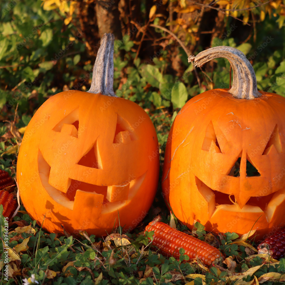 Two carved Halloween pumpkins with red and orange corn cobs in the garden on autumn season. Halloween background