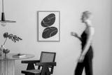 Warm and cozy interior of living room space with mock up poster frame, round table, chairs, pedant lamp, rattan chairs and walking young woman. Minimalist home decor. Template.
