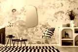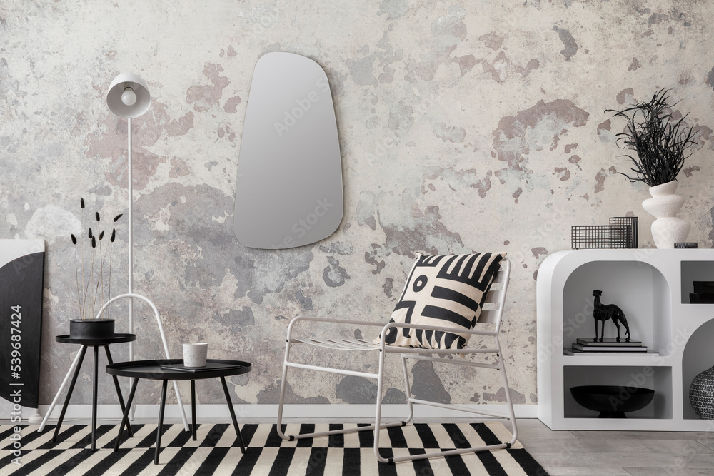 Interior design of loft industrial apartment with modern white chairs, black round coffee table, modern mirror, patterned pillow and carpet. Grey concrete wall. Home decor. Template.