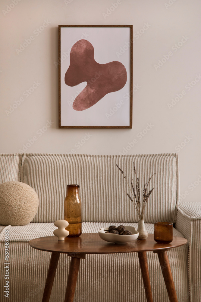 Creative composition of living room interior with mock up poster frame, corduroy sofa, wooden coffee table, pillow, glassy case, bowl with dried fruit, decoration and personal accessories. Template