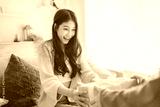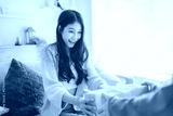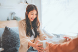 Excited asian woman getting surprise gift from her girlfriend at home. Gives a gift. New year day celebration and congratulation