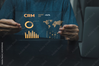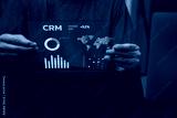 Business man holding screen virtual icon crm Customer relationship management. Business Internet Technology marketing solution Concept.