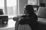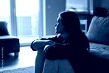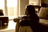 Caucasian sad woman sitting at the floor and looking throw window at home