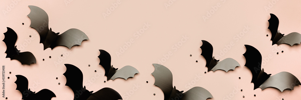 Minimal flat lay with black bats as halloween party background, copy space. Creative pattern from paper decorations flying bats on pastel beige pink background for holiday. Halloween banner