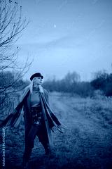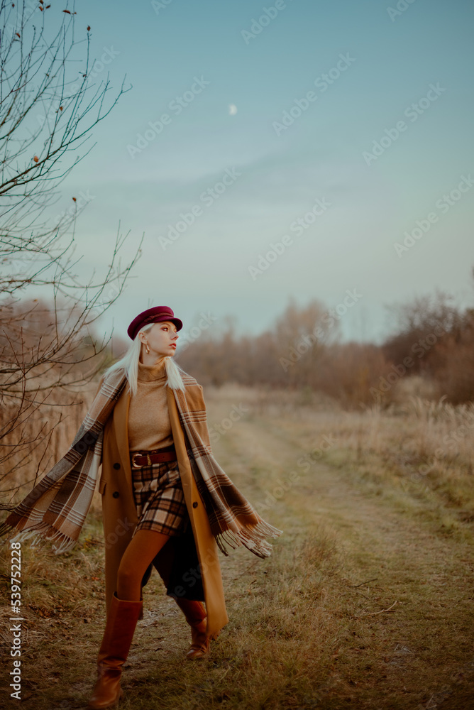 Fashionable elegant blonde woman wearing trendy autumn outfit with classic brown coat, trendy cap, plaid scarf, turtleneck, mini wrap skirt, leather boots, walking outdoor. Full-length portrait