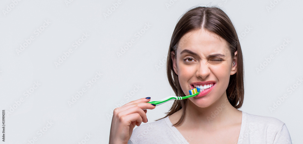 Smiling woman with healthy beautiful teeth holding a toothbrush. Dental health background. Portrait of a smiling cute woman holding toothbrush