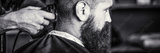 Hands of barber with hair clipper, close up. Haircut concept. Hipster client getting haircut. Black and white