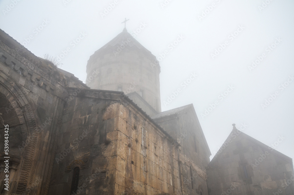 Saints Paul and Peter church silhouette of Tatev monastery complex in dense fog