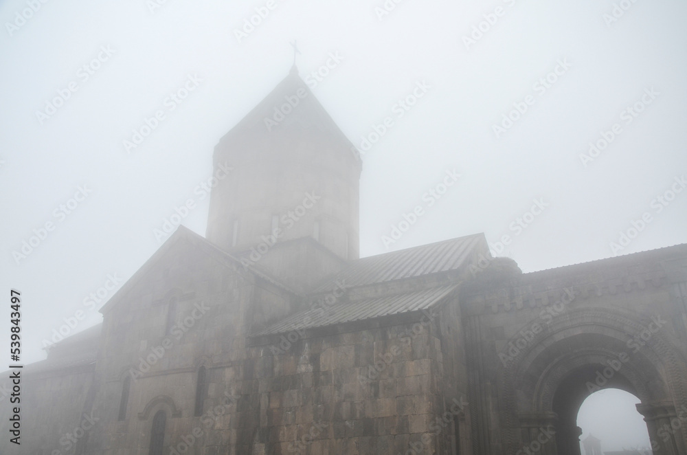 Saints Paul and Peter church silhouette of Tatev monastery complex in dense fog