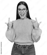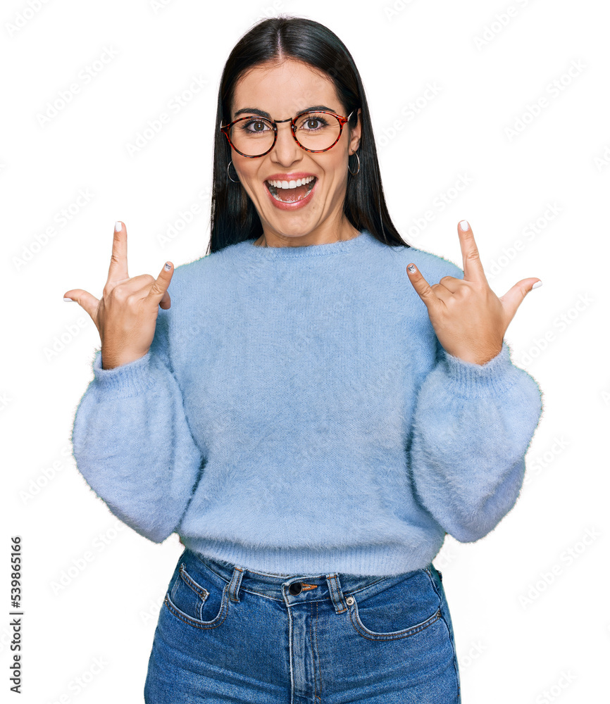 Young hispanic woman wearing casual clothes and glasses shouting with crazy expression doing rock symbol with hands up. music star. heavy concept.