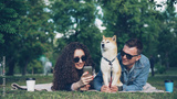 Young woman is showing funny pictures on smartphone to her cheerful boyfriend while relaxing in park with pet dog, people are lying on plaid on grass and watching screen.