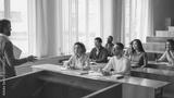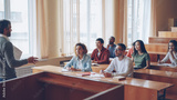 Experienced high school teacher is talking to cheerful students while attractive young people are listening, smiling and laughing sitting at desks in light classroom.