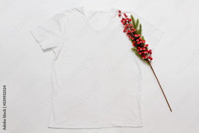 Close up white blank template t shirt with copy space and Christmas Holiday concept. Top view mockup t-shirt and red holidays decorations on white background. Happy New Year accessories. Xmas outfit