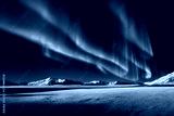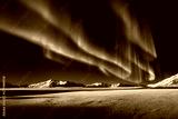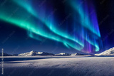 Aurora borealis on the Norway. Green northern lights above mountains. Night sky with polar lights. Night winter landscape with aurora and reflection on the water surface. Natural back