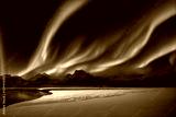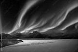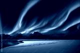 Aurora borealis on the Norway. Green northern lights above mountains. Night sky with polar lights. Night winter landscape with aurora and reflection on the water surface. Natural back