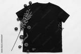 Close up black blank template t shirt with copy space and Christmas Holiday concept. Top view mockup t-shirt and red holidays decorations on white background. Happy New Year accessories. Xmas outfit