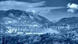 A color photo over looking a harbor in the Greek Isles.