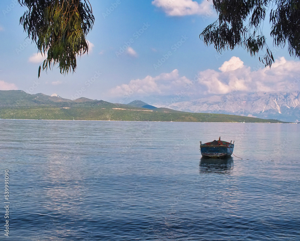 A color photo of a lone boat on the Ionian Sea on a beautiful day in the Greek Islands.