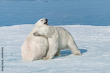 Two young wild polar bear cubs playing on pack ice in Arctic sea, north of Svalbard