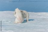 Two young wild polar bear cubs playing on pack ice in Arctic sea, north of Svalbard