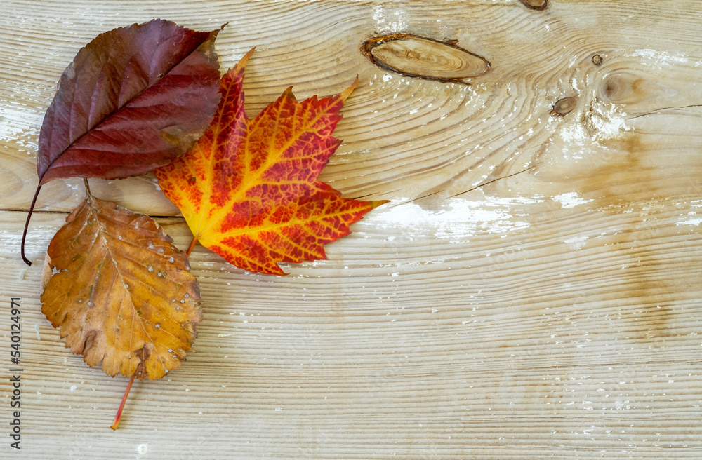 colorful autumn leaves on rustic pine boards background, background for your projects