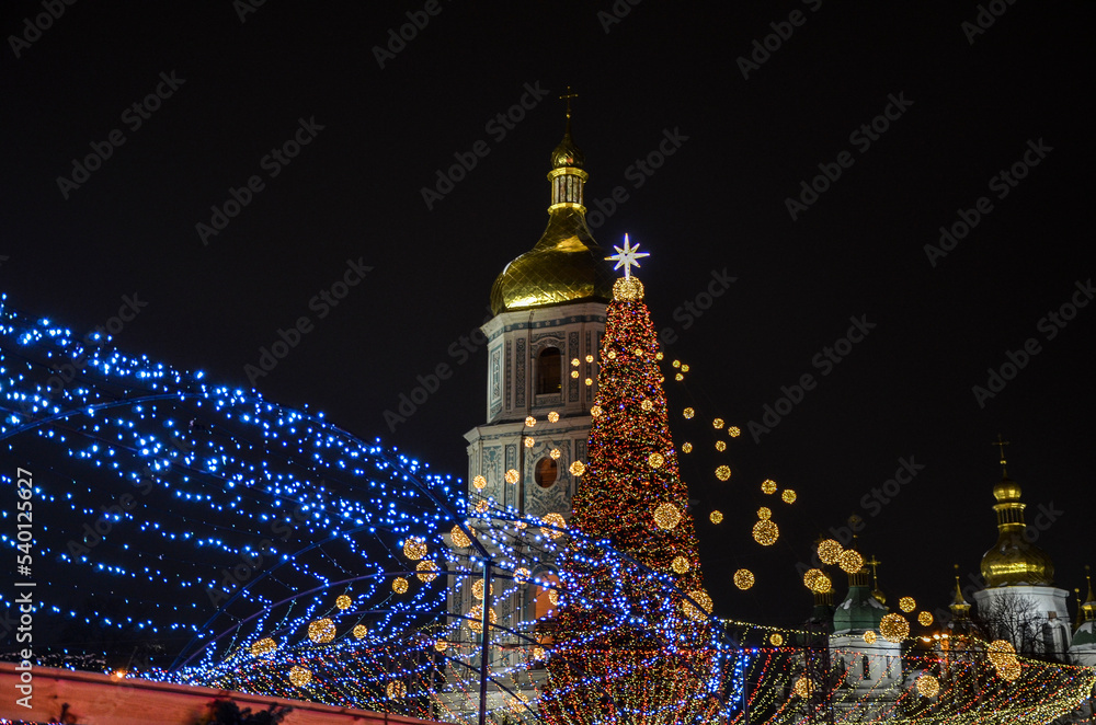 New Year tree with a lot of illumination and light, with Sophia Cathedral on background. Kyiv, Ukraine
