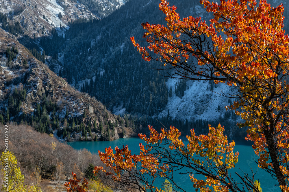 A branch of an apricot tree with red-yellow leaves and an alpine picturesque lake on an autumn day