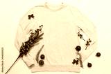 Close up white blank template sweatshirt with copy space and Christmas Holiday concept. Top view mockup hoodie and red holidays decorations on white background. Happy New Year accessories. Xmas outfit