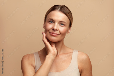 Smiling Woman Touching Face. Waist up Portrait of Attractive Woman Touching her Skin and Smiling. Woman Appearance and skin Care Concept