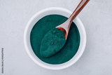 Spirulina. Green algae powder chlorella, spirulina in bowl on gray stone background. Top view, copy space
