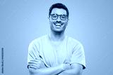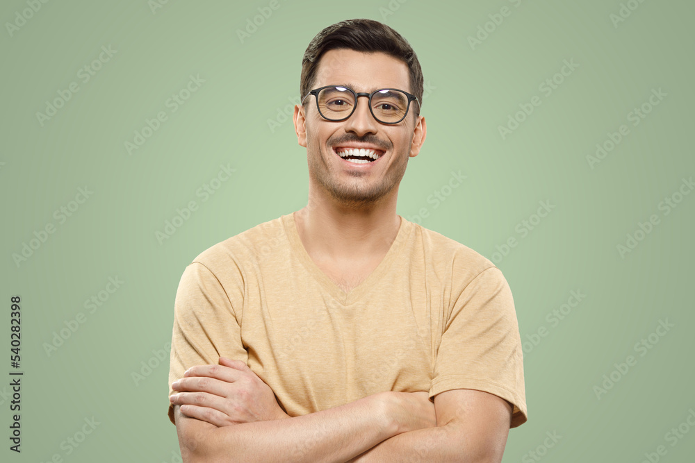 Young male in beige t-shirt and eyewear with crossed arms laughing at joke on green background