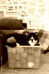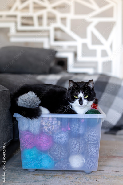 A black and white cat sits on a box with balls of thread in the apartment. Home furnishings .