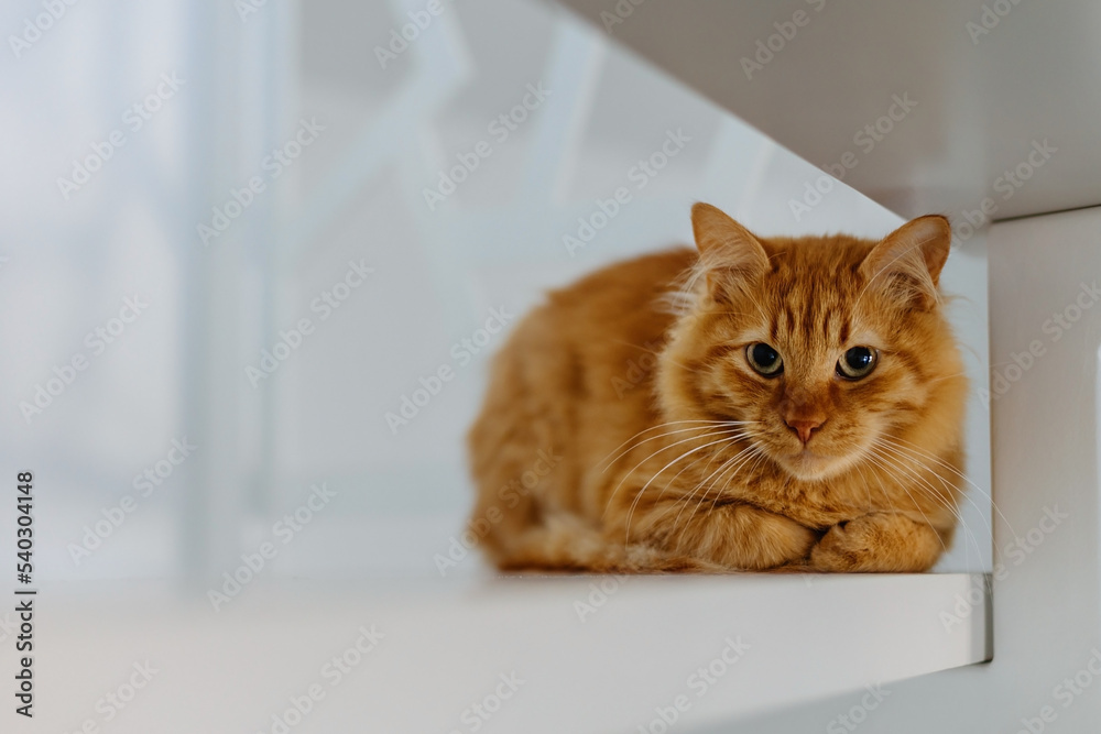 A beautiful ginger kitten sits on a stair step in an apartment.