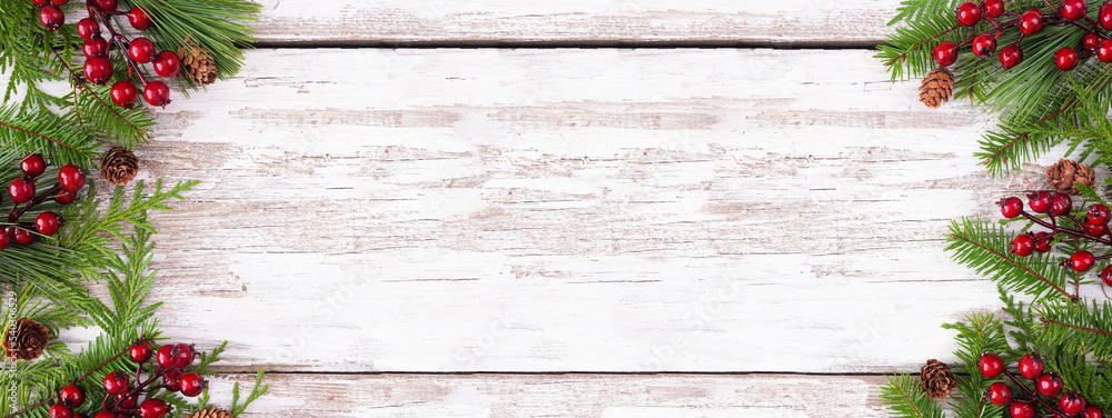 Winter double border with evergreen branches, red berries and pine cones. Overhead view on a rustic white wood banner background with copy space.