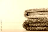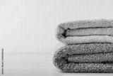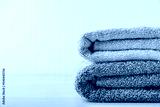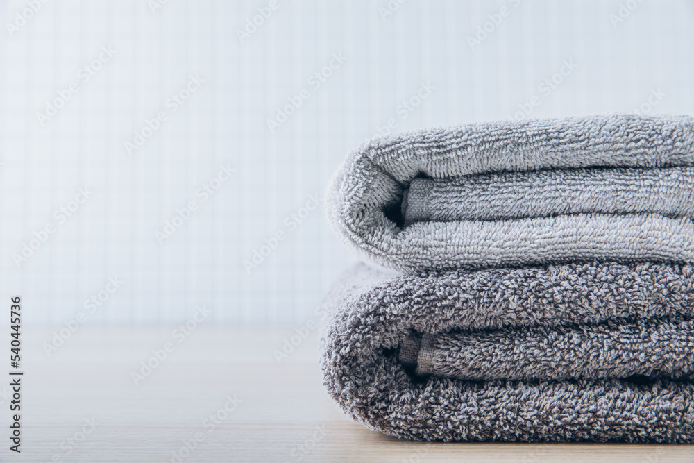 Towels. Clean fresh fluffy gray towels on table in bathroom
