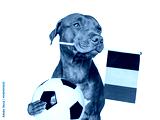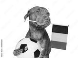 Charming, adorable puppy, holding national flag Belgium and soccer ball. Preparation for the championship and tournament. Closeup, indoors. Studio photo. Concept of care and obedience training pet
