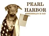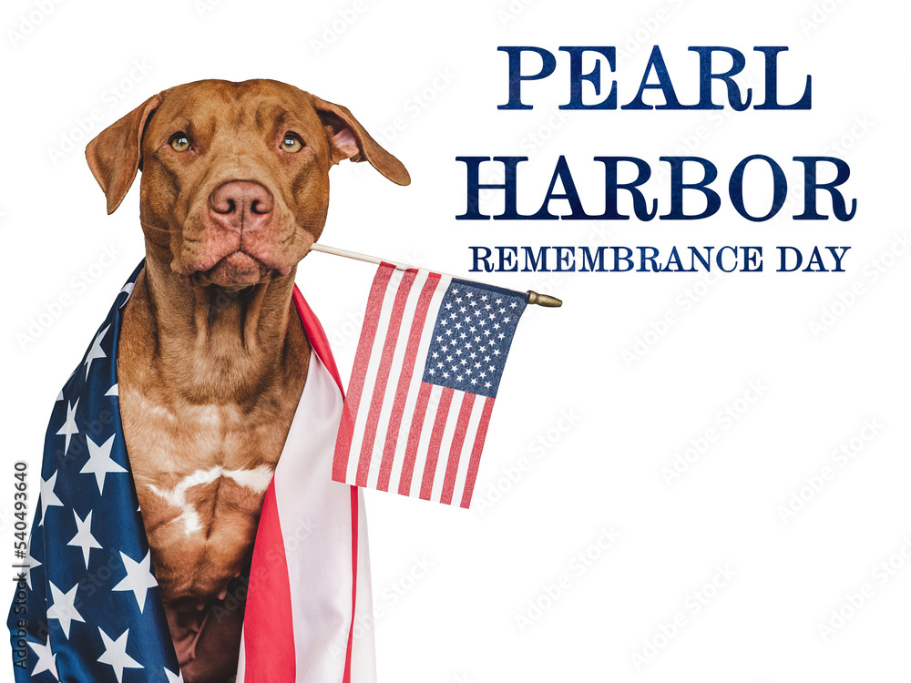 Pearl Harbor Remembrance Day. Sweet puppy and American Flag. Studio photo. Closeup, no people. National holiday concept. Congratulations for family, relatives, friends and colleagues