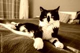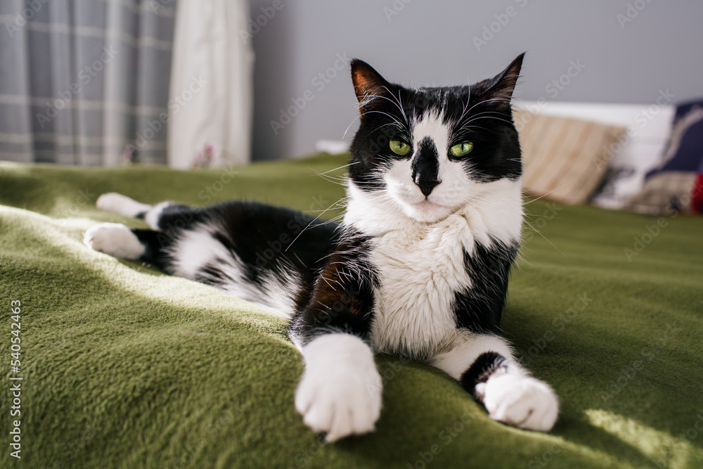 A beautiful black and white cat lies on the bed. Home furnishings .