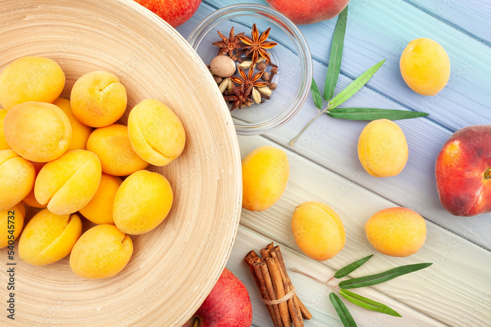 apricot group on wood background top view