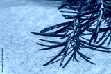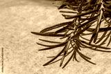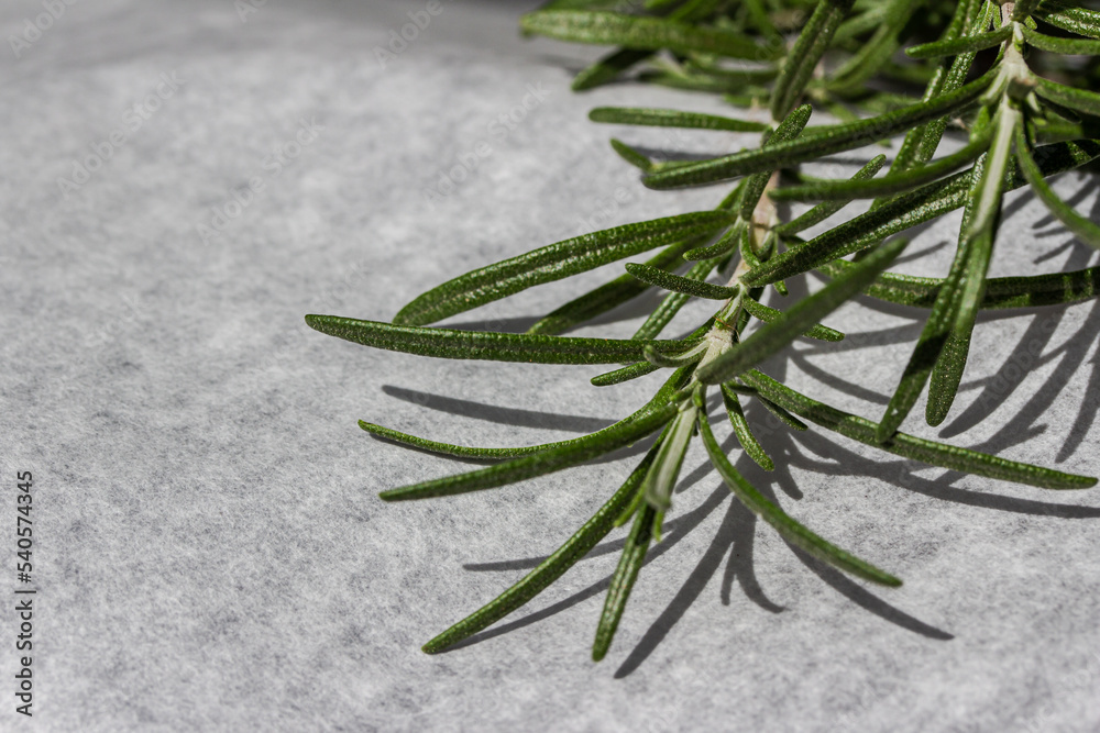 Macro abstract texture view of a sprig of rosemary (salvia rosmarinus) herb on a defocused white parchment paper background
