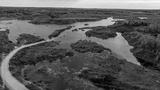panoramic view from a drone of a network of lakes and islands with a yellow forest against the backdrop of autumn colors