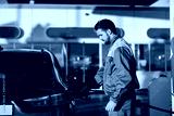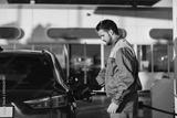 A gas station worker holds a petrol dispenser and fills up the car tank.