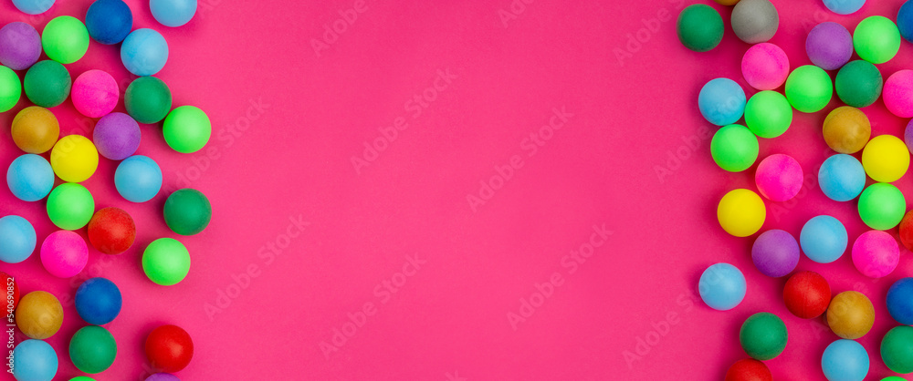 Abstract colored balls background. Multi-colored taw toy scattered on bright paper. Base for design nice backdrop, wallpaper, poster. Noisy surface texture