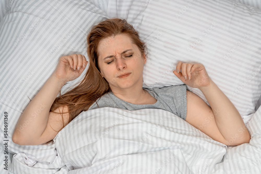 Woman holding hands on head due to headache waking up in bed at home. Lady with long hair in pajamas. Girl on clean white bedding with cozy blanket. Insomnia, sleeplessness