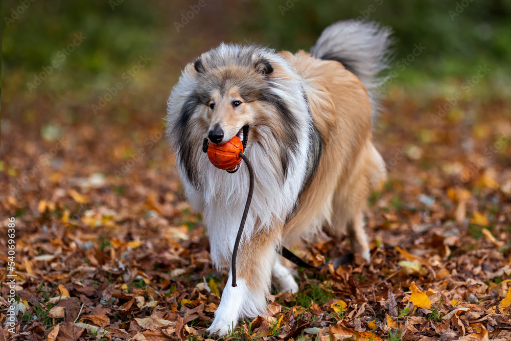 Collie dog carries a red ball. Autumn background.