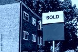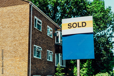 Sold sign near multi-storey building with apartments. Red real estate sign near house outdoors on sunny day. Selective focus, copy space.