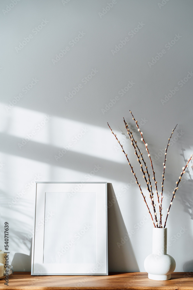 Modern minimalist style interior with white poster mockup, candles and blooming branches of the pussy willow in vase on wooden console under sunlight and shadows on a white gray wall. Selective focus.